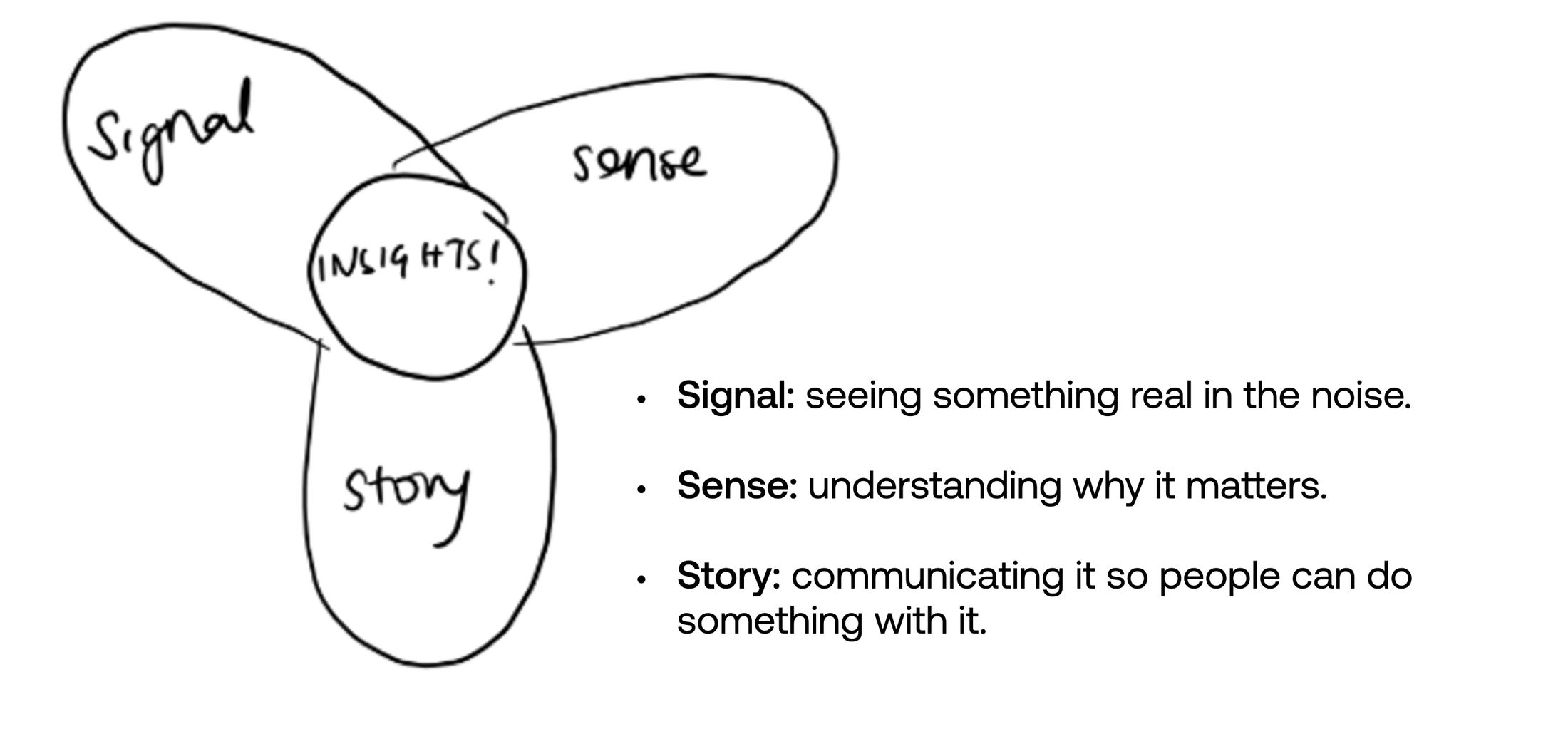 If you had to draw it (and I like to, so please see picture below), insight would sit where three potatoes overlap: Signal, Sense, and Story.